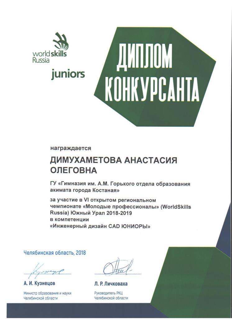 В чемпионате принимали участие представители различных регионов: Москва, 9 краев и областей Российской Федерации, Республика Татарстан и Республика Казахстан. Ученица 10 класса гимназии имени А.М. Горького Димухаметова Анастасия представляла на данных соревнований не только наш город, но и всю Костанайскую область. В итоговом зачете соревнований Анастасия заняла II место.