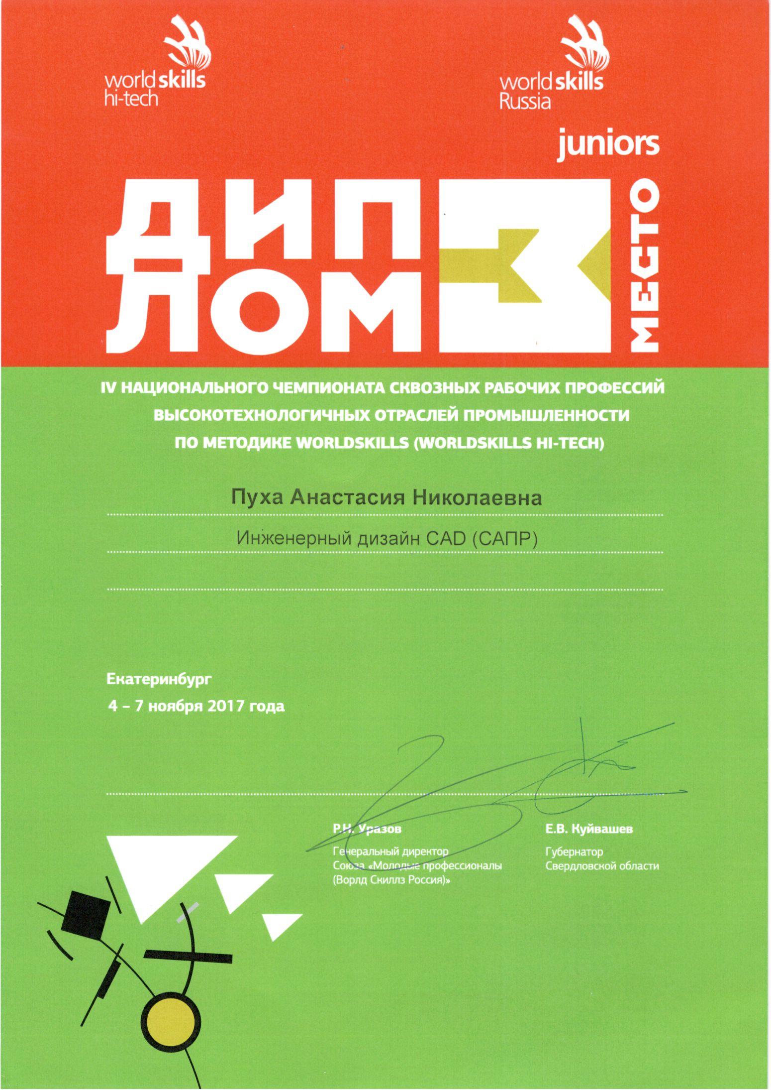 Поздравляем наших юных "Инженеров будущего" Димухаметову Анастасию (9б) и Пуха Анастасию (9А) учавствовавших в национальном чемпионате сквозных рабочих профессий высокотехнологичных отраслей промышленности по методике Worldskills Hi-Tech , со 2 по 8 ноября 2017 года в городе Екатеринбурге и занявших в компетенции «Инженерный дизайн CAD (САПР)» «Машиностроительное проектирование» Возрастная группа: 14-16 лет почетное III - место.