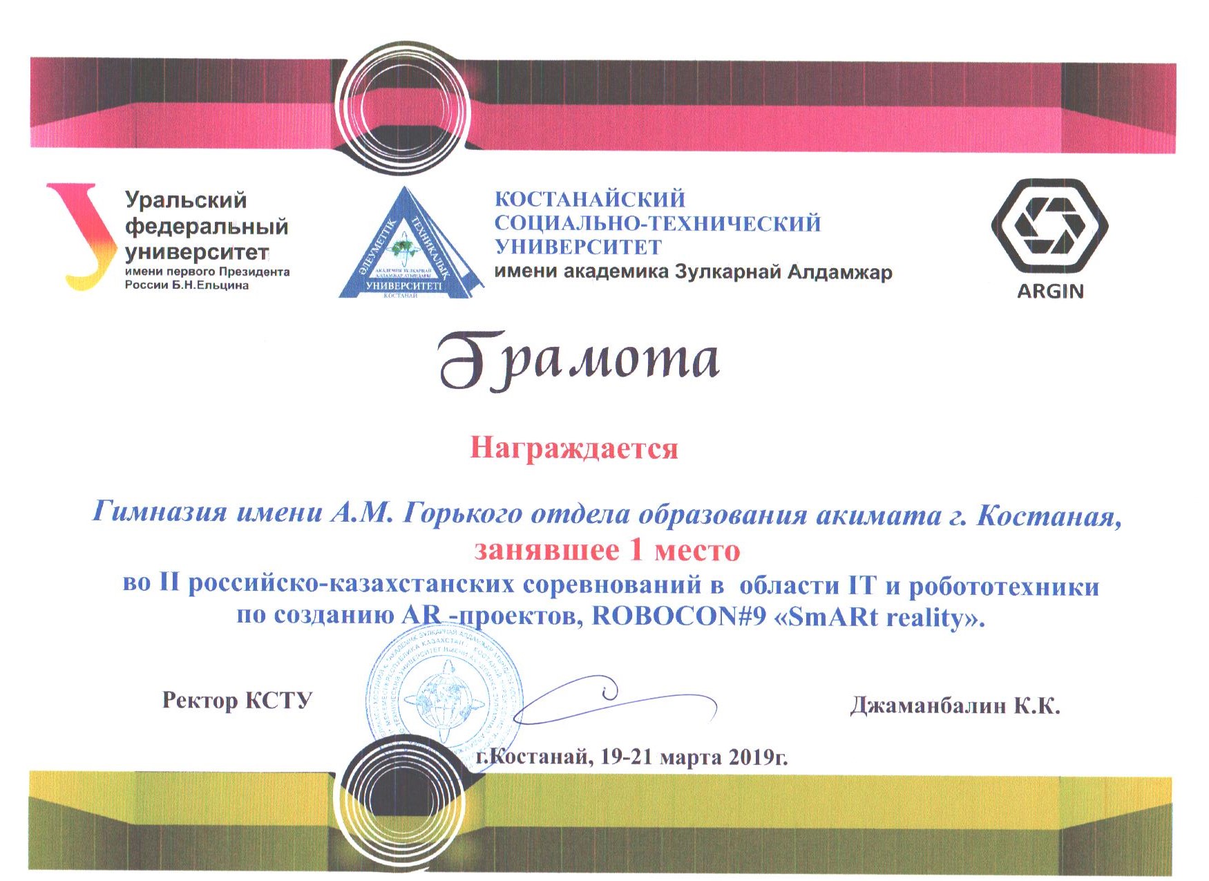 19-21 марта 2019 г. на базе Костанайского социально-технического университета имени академика З.Алдамжар совместно с Уральским федеральным университетом им. первого Президента России Б.Н.Ельцина (Екатеринбург), ТОО «СарыАркаАвтопром» (Костанай) и школами г. Костаная проведены II Российско-казахстанские открытые соревнования в области IT и робототехники по созданию AR -проектов, ROBOCON#9 «SmARt reality» в формате семинара-тренинга ХАКАТОНА.